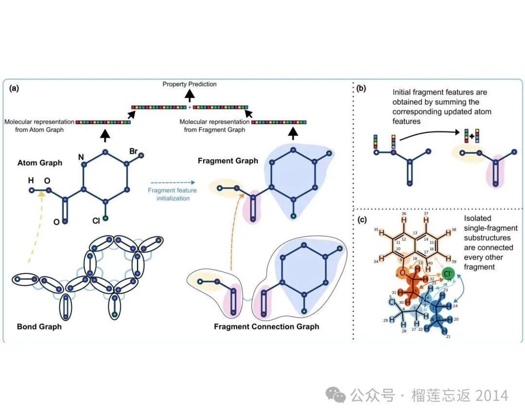 图 1:FragNet 的架构和数据表示。(a)原子图和片段图的边特征分别从键图和片段连接图中学习。(b)片段图的初始片段特征是组成片段的更新原子特征的总和。(c)FragNet 消息传递在化合物的两个非共价键合子结构之间发生的示意图。片段 - 片段连接也存在于化合物的每个非共价键合结构中的相邻片段之间。